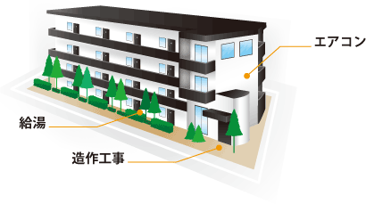 営繕事業部では日常的に発生する突発的な修理工事に対して、安価で状況に応じた工事内容・品質を提供する為、受注から完了検査まで自社で施工に取り組んでいます。 緊急時も自社施工で、早急に対応! エアコン 夏場のエアコンは急ぎが原則です。当社では、例年、夏場のシーズンに合わせ本体を大量購入し、対応しております。 給湯 給湯器の交換等、敏速に対応します。